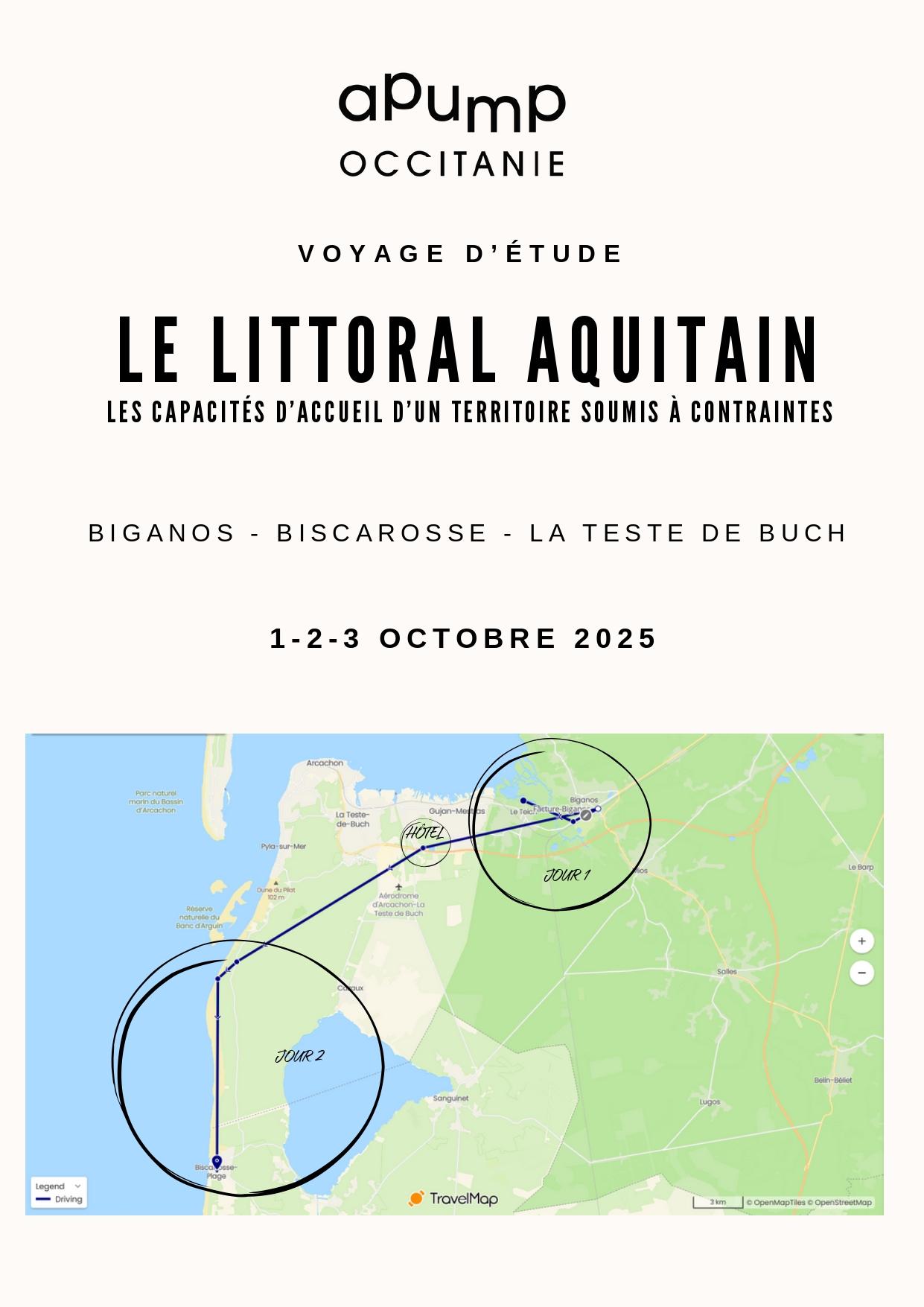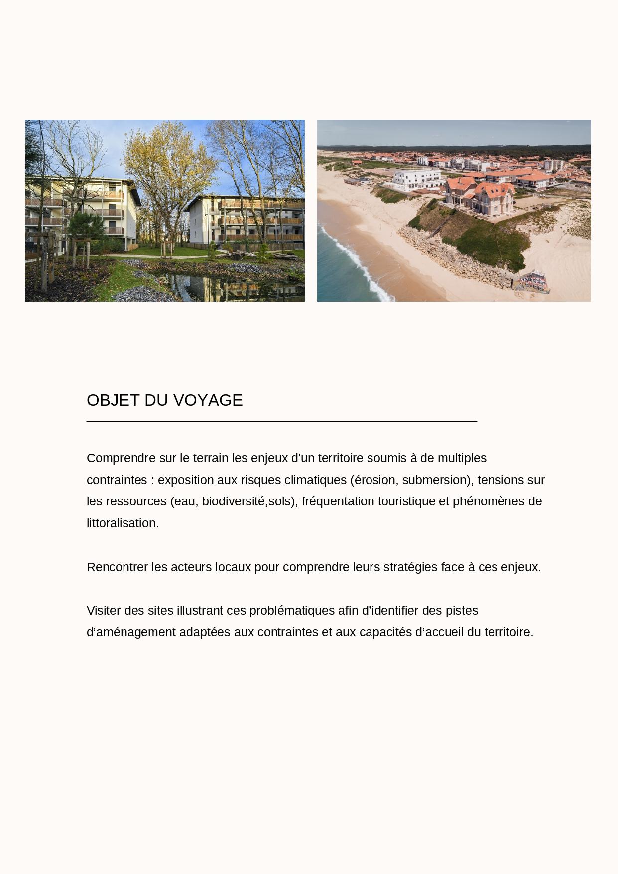 Objectifs du voyage : Observer sur le terrain les impacts de la forte fréquentation touristique et de la littoralisation sur le territoire : pression sur l’habitat, exposition aux risques climatiques (érosion, submersion), tensions sur les ressources (eau, biodiversité,sols). Rencontrer les acteurs locaux pour comprendre leurs stratégies face à ces enjeux.Visiter des sites illustrant ces problématiques afin d’identifier des pistes d’aménagement adaptées aux contraintes et aux capacités d’accueil du territoire.