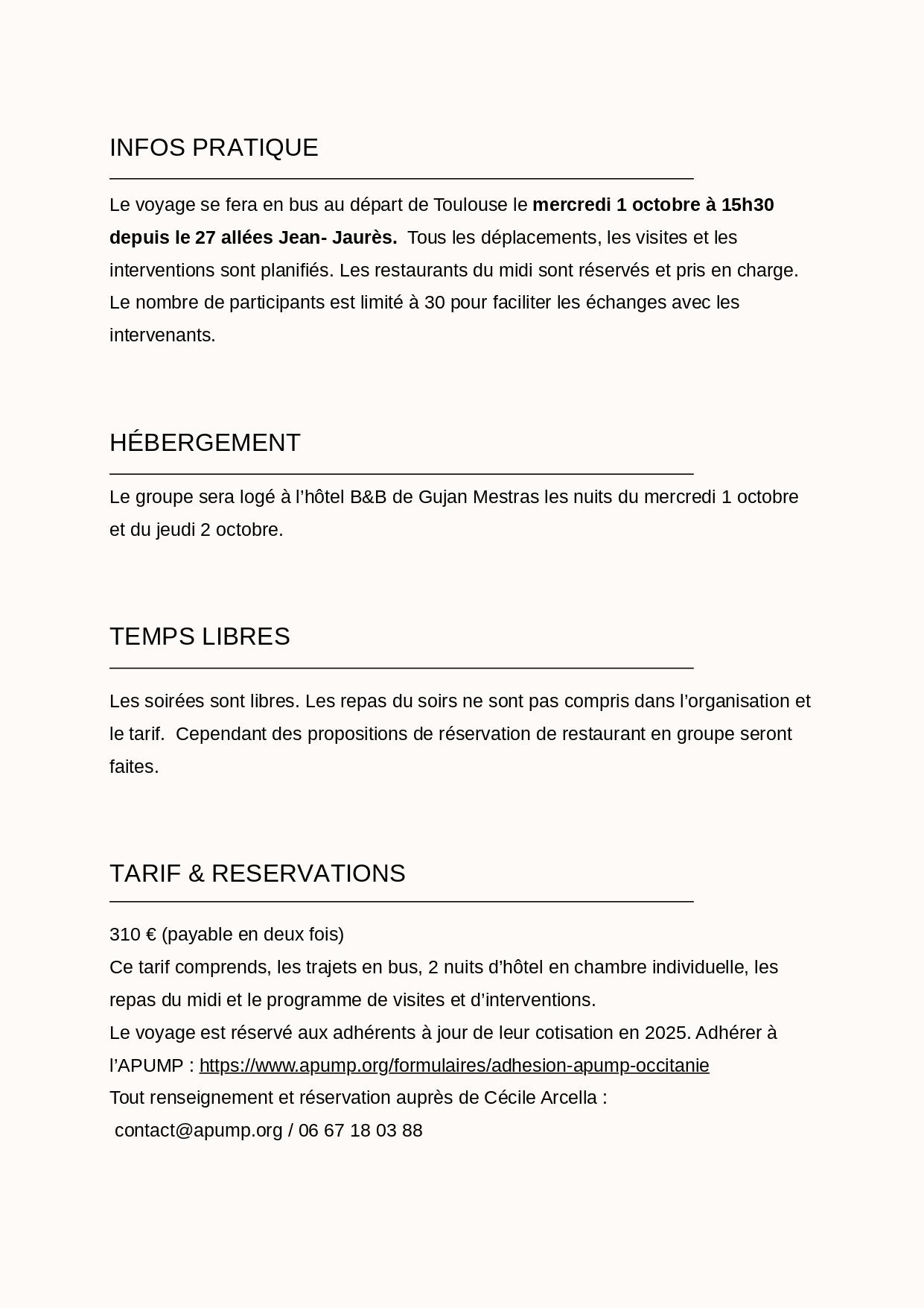 Infos pratiques : Le voyage se fera en bus au départ de Toulouse le mercredi 1 octobre à (16h), tous les déplacements, les visites et les interventions sont planifiés. Les restaurants du midi sont réservés et pris en charge. Le nombre de participants est limité à 30 pour faciliter les échanges avec les intervenants.