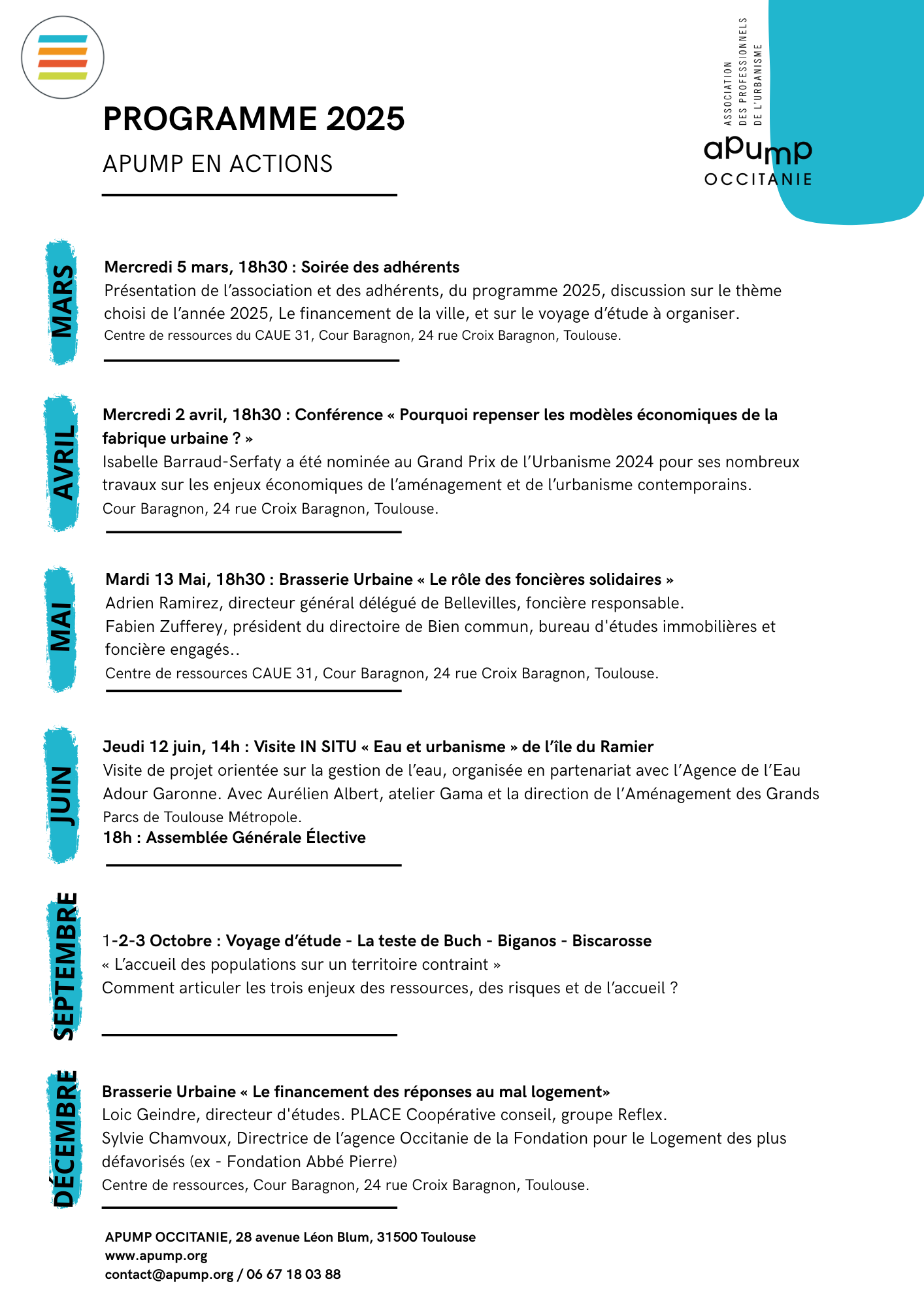 L'association des Professionnels de l'Urbanisme Midi-Pyrénées Occitanie a pour objet de constituer un lieu de débats sur l’urbanisme, la ville, l’aménagement de l’espace et du territoire, ouvert à tous les acteurs de l’urbanisme.